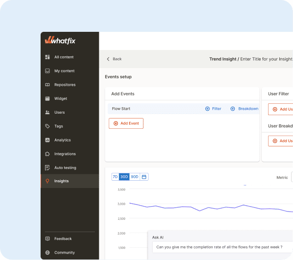 Whatfix Product Analytics provides visibility into how users interact with your CRM, highlighting drop-offs and inefficiencies at a granular level. Its AI Insights proactively surfaces user trends and identifies areas of friction, suggesting new in-app guidance and enablement content to support your users at they key trouble spots. From there, teams can deploy Flows, Smart Tips, or Pop-Ups to guide users through problematic steps or reinforce best practices. This feedback loop keeps the CRM aligned with user needs and business goals.