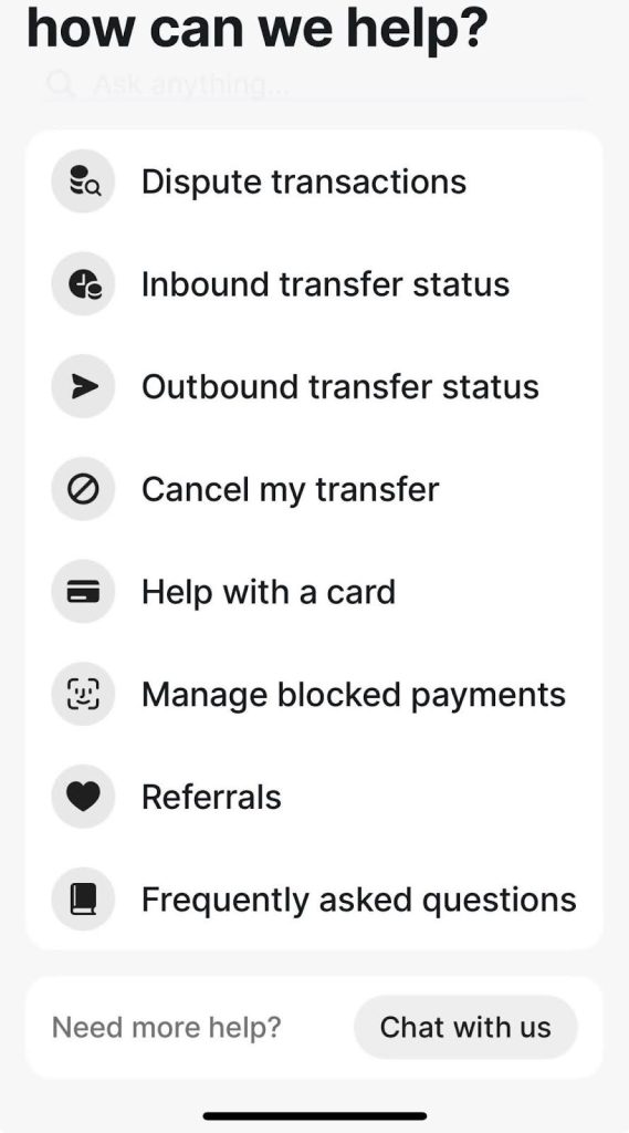 Revolut, an online banking app, is a great example. In the help section of the app, they show you three options right away – self-serve help based on what task you’d like to accomplish, browse FAQs, or join a live chat with a customer service agent.