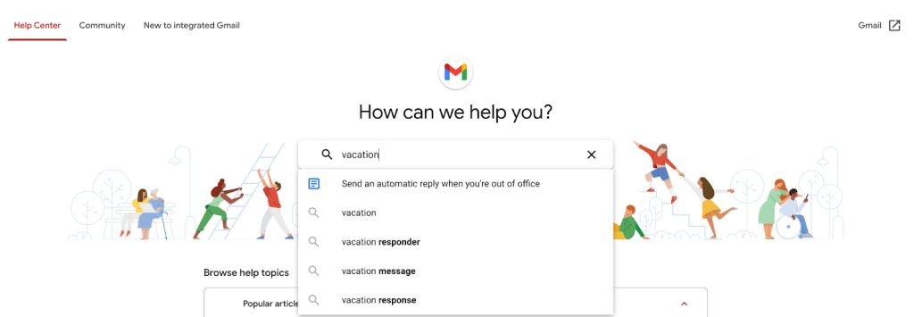 For example, Gmail offers a self-help knowledge base that shows articles not only based on keywords, but also based on general related themes. In the screenshot below, you can see that when you search for ‘vacation,’ it knows to show an article about automatic replies. This is proactive and intelligent, resulting in a seamless self-serve experience for Gmail users.