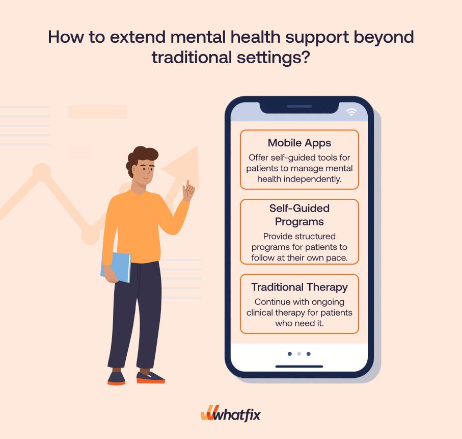 Not every patient needs or has access to ongoing clinical therapy, which has fueled the growth of mobile apps and self-guided programs. From CBT-based tools to meditation apps and mood trackers, these solutions empower people to manage aspects of their mental health on their own terms. For providers, they also offer a way to extend support beyond traditional care settings and reach underserved populations.