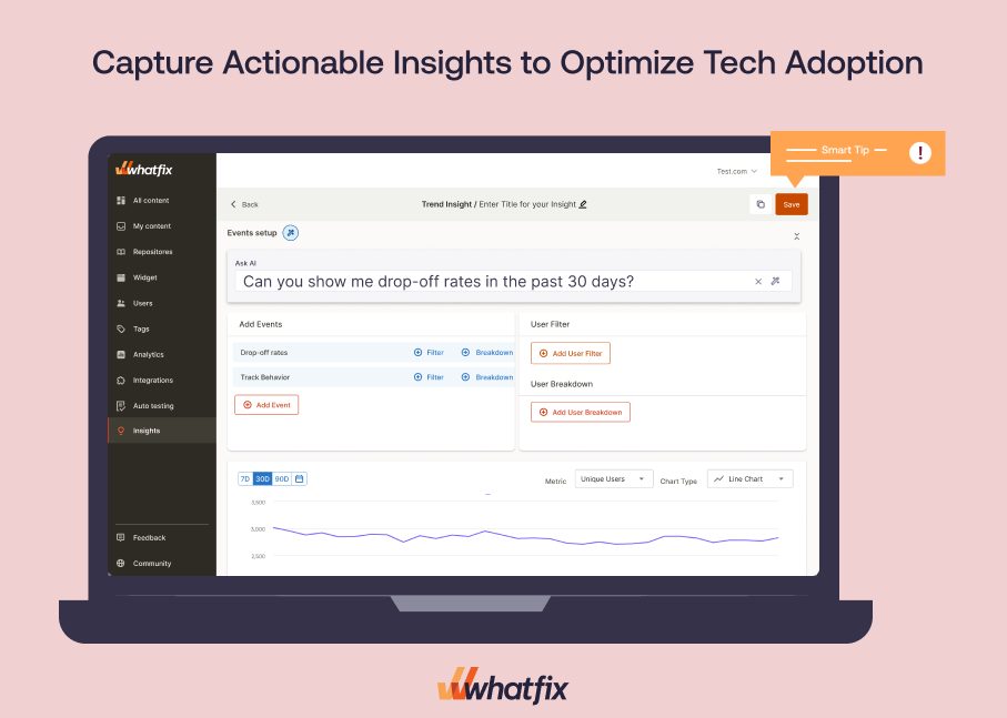 Whatfix Product Analytics uses AI and real-time event tracking to help providers understand pain points for both patients and employees, and make data-informed decisions. With this tool, clinicians and other operational teams can measure the impact of digital transformation initiatives and continually improve user experience and overall mental health services.